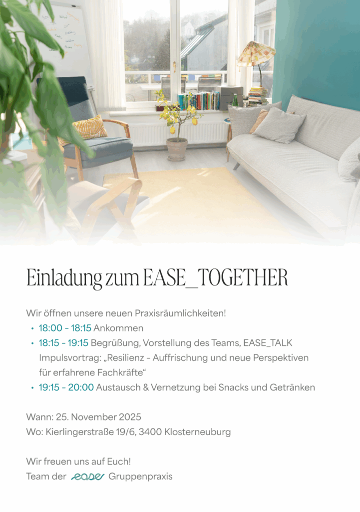 • 18:1519:15 Begrüßung, Vorstellung des Teams, EASE_TALK Impulsvortrag: „Resilienz – Auffrischung und neue Perspektiven für erfahrene Fachkräfte“